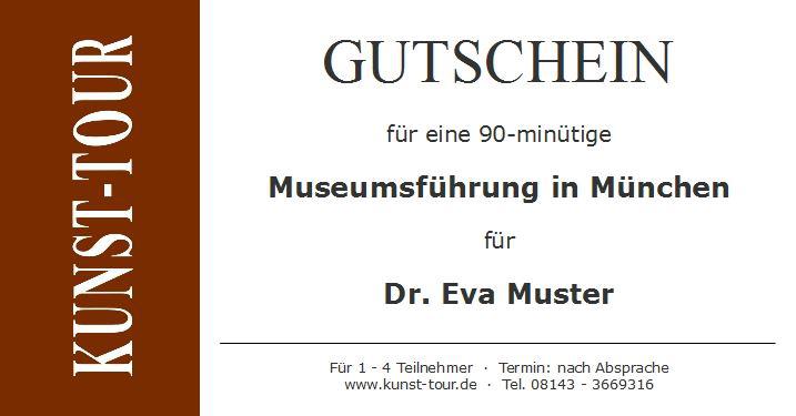Schenken Sie das ganz besondere Erlebnis für alle, die schon "alles" haben. Schenken Sie eine Kunst-Tour! Sehr gerne beraten wir Sie. Die Auswahl ist groß. Ihr Geschenkgutschein (siehe Abbildung) trägt den Namen der Beschenkten und die Führung der Wahl. Unser edles Gutschein-Set mit Deckblatt und Couvert schicken wir Ihnen postalisch oder - wenn s schnell gehen soll - den Gutschein auch per E-Mail als PDF.